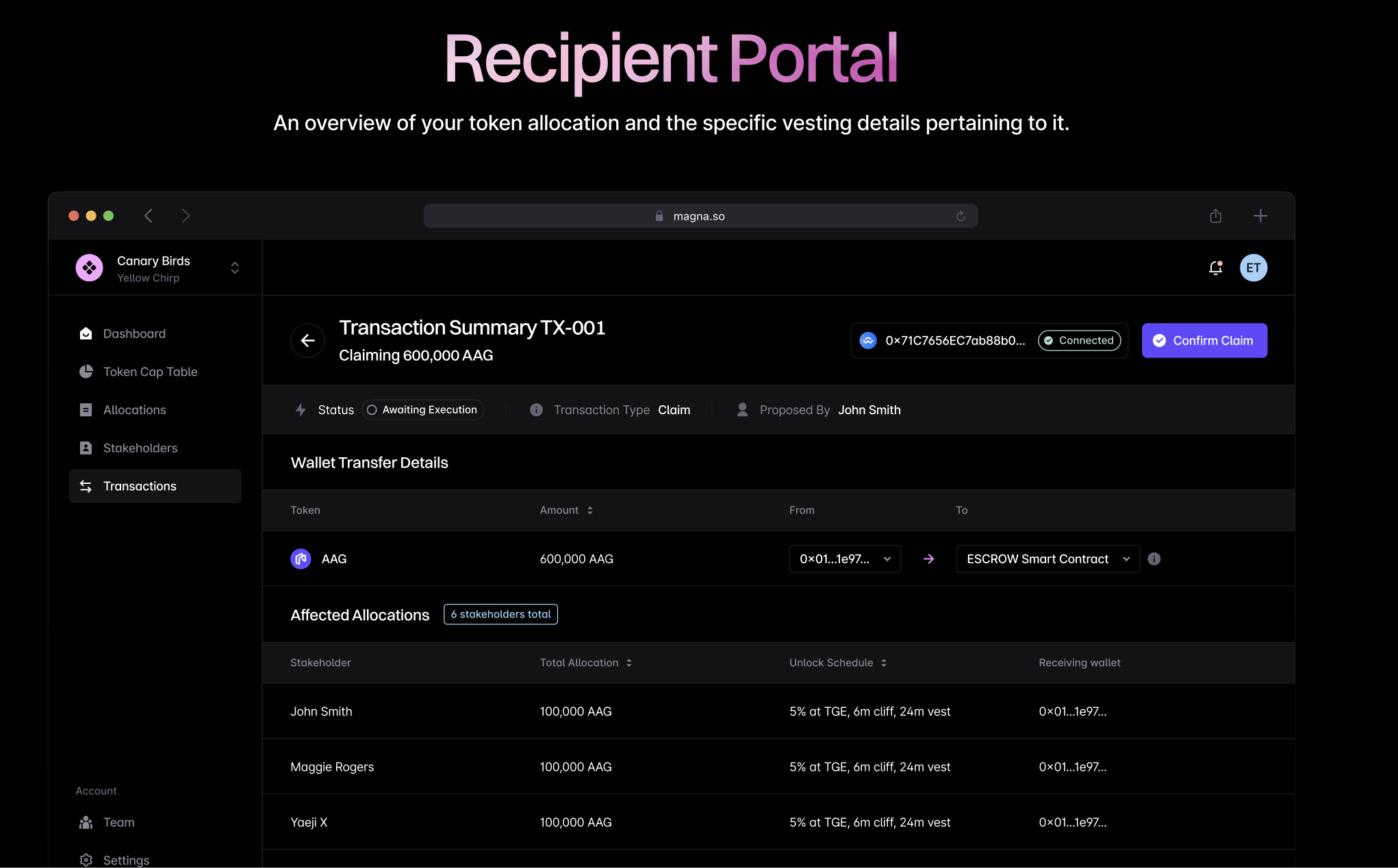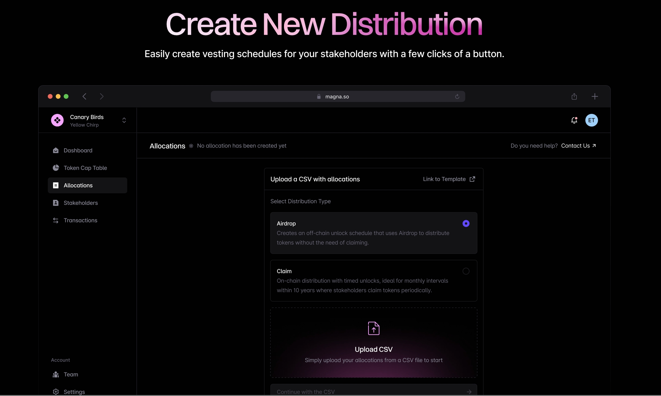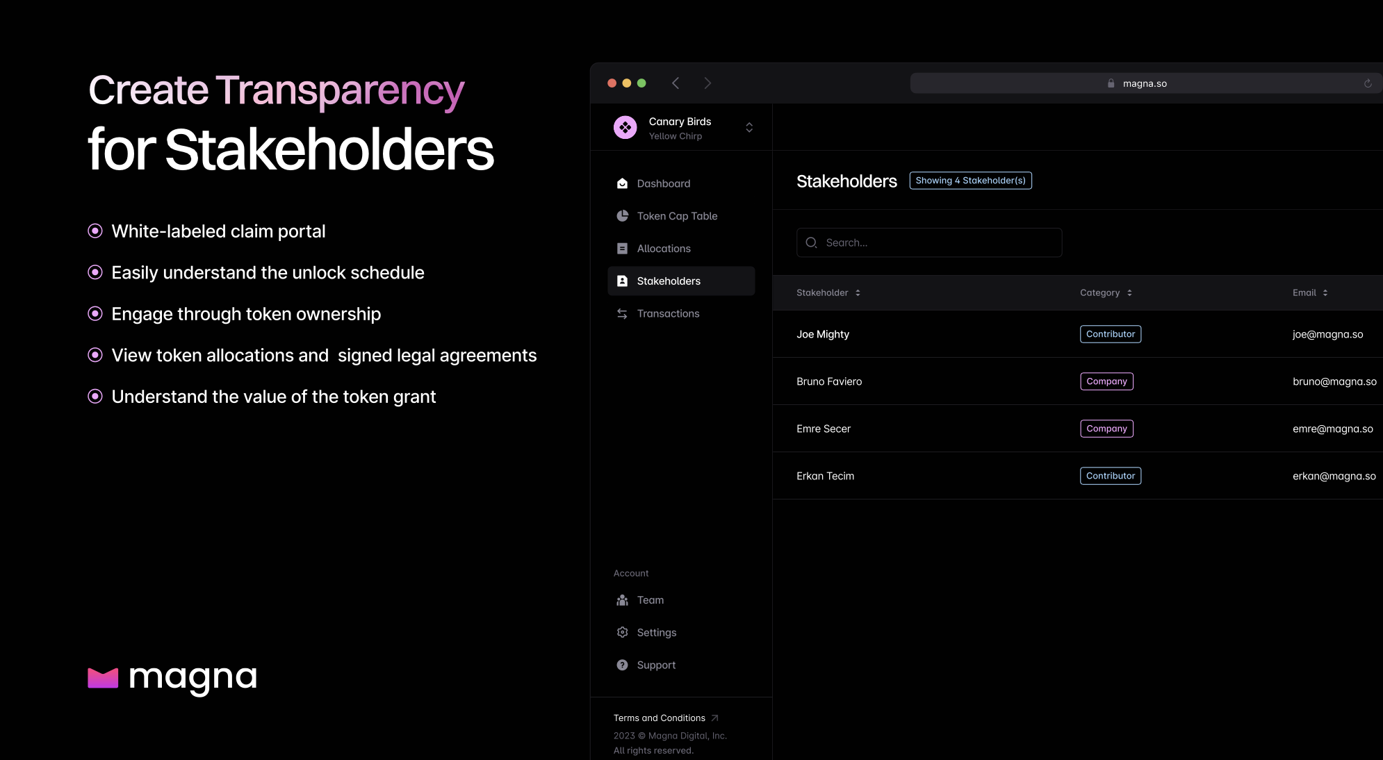 Magna is token management on autopilot. We provide sustainable token infrastructure for projects building in web3. Magna allows companies to upload and track token allocations for their stakeholders.