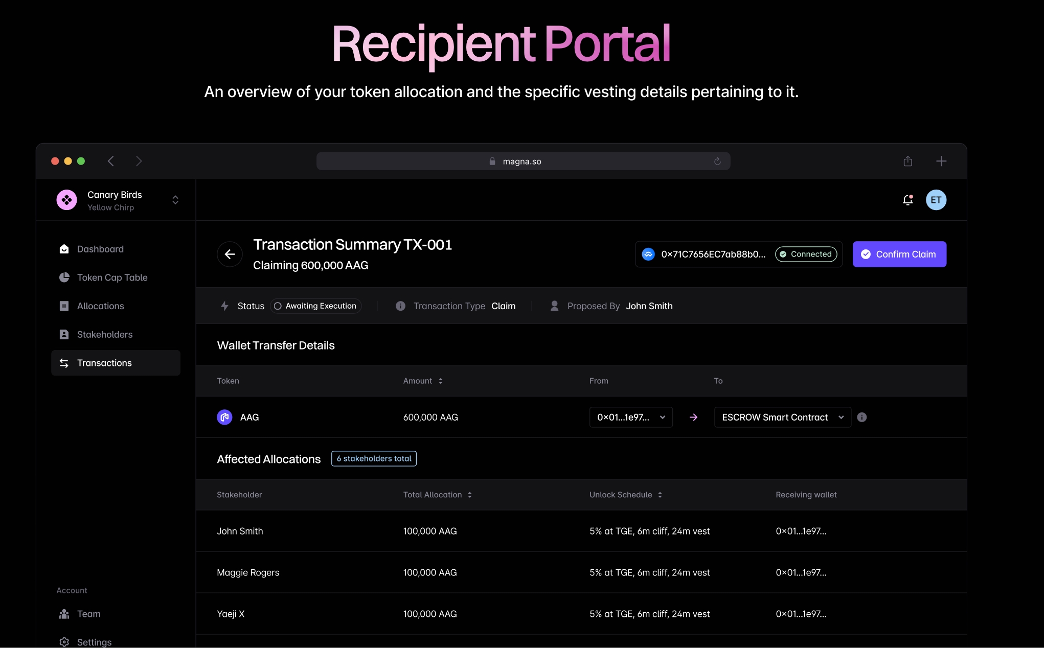 Stakeholder Experience: Stakeholders benefit from having an easy to use and understandable UI that helps them understand their allocation, unlock schedule, when they'll receive tokens next, and how to claim them.