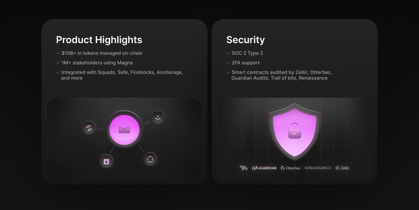 Magna has commissioned over 10 smart contract audits to-date, working with top auditing firms including Ottersec, Zellic, Trail of Bits, Guardian Audits and Renascence. Audits are available upon request & all customers are welcomed into our Github repository to review our code.